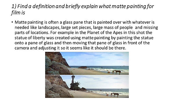 These are three Powerpoints I made on green screen, matte paintings and rotoscoping. These show how all these visual effects first came about, their history through the time of cinema and television and how each effect is used in today's world and today's media. The history of visual media always fascinates me from how these techniques were first originally used and how they became more common or easier to create as time passed.
